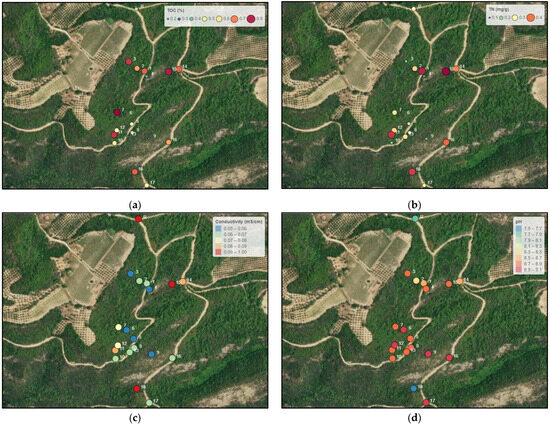 The concentrations of total organic carbon appeared to be higher in the southern and northern parts of the study area, while the lower concentrations were spotted in the central part. Similarly, the highest total nitrogen concentrations were observed in the northern and northeast parts, unlike the lower concentrations, which were found in the central part of the area. The pH concentrations displayed an increase from the northern and southern parts of the region towards its center, while the electrical conductivity values appeared to be higher in the northern parts and lower in the southern part of the study area (Figure 9).
