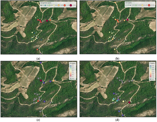 Distribution of Mn (a), Fe (b), Pb (c), and P (d) of the studied soil samples.