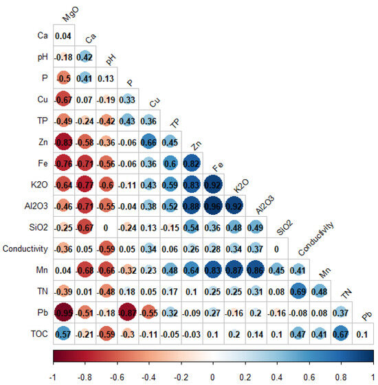 The above statistical analysis revealed a negative correlation between pH and electrical conductivity, as well as the existence of a negative correlation between Mg and Fe, K, and Pb. On the contrary, the correlation of TOC with Mg and electrical conductivity seems to be quite positive, as well as the correlation of Si with K and Fe. Noteworthy is the strong negative correlation between Pb and P.
