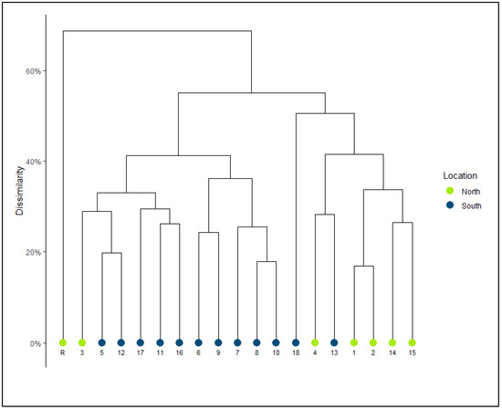 A differentiation among the southern and northern parts of the study area and the potential relationships between samples were further explored with the use of a hierarchical cluster analysis (HCA). Samples were categorized into clusters according to their squared Euclidean distance, and the results are presented in Figure 13. The dendrogram shows a dissimilarity between the sample sites, let alone the differentiation between the northern and the southern parts of the study area. As a result, we can distinguish three main clusters. The first cluster (C1) contains samples 3, 5, 12, 17, 11, 16, 6, 9, 7, 8, and 10, the second cluster (C2) contains samples 18, 4, 13, 1, 2, 14, and 15, and the third cluster (C3) is defined by the presence of the sample R, the reference material from the unburned site (Figure 13).