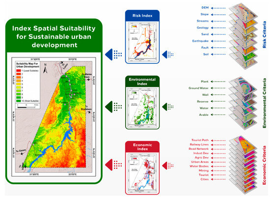 This study uses the Aswan Governorate model in southern Upper Egypt to determine the spatial suitability of sustainable urban development in the Egyptian deserts, ensure resource sustainability, and contribute to environmentally sustainable urban and economic growth in line with Egypt’s Vision 2030. To achieve these goals, a GIS-based multicriteria decision-making (GIS-MCDM) approach was used, through an innovative approach for integrating three main indicators: the risk index, environmental sensitivity, and economic resources. These indicators were divided into twenty-four criteria, and their weight was determined according to preference through the analytic hierarchy process (AHP). This study serves developmental, national, and expected regional and local development efforts for developing desert regions in the Aswan Governorate, which exceed 80% of the governorate’s area and represent the future of sustainable urban development. This study found three spatial suitability categories, with the largest between 50 and 70% suitability. The first category, with suitability greater than 70%, covers 27.2% of the Aswan Governorate in the north, on both sides of the Nile. Areas with medium spatial suitability, ranging from 50% to 70%, constitute the second category, accounting for 40.3% of the Aswan Governorate, with a concentration in the central regions. The third category includes areas with low spatial suitability, at less than 50%, which make up 32.5% of the governorate.