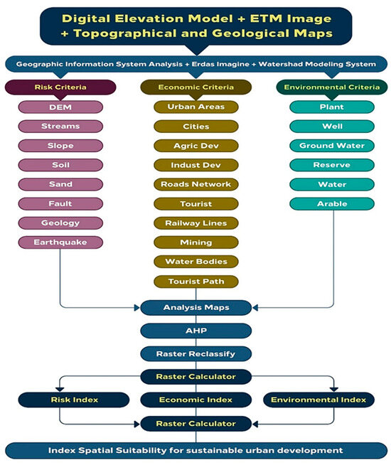 To assess the suitability of Egyptian deserts for urban development in the Aswan Governorate, a GIS-based multicriteria decision-making (GIS-MCDM) approach was employed. This approach utilizes the analytic hierarchy process (AHP), a method developed by Saaty [24], which is a structured technique for analyzing complex decision-making processes. The AHP allows for the evaluation of individual criteria through quantitative analysis. It has been widely used in various decision-making scenarios [25,26]. The analytic hierarchy process (AHP) is widely recognized as the predominant method in the field of multicriteria decision-making (MCDM) [27,28].