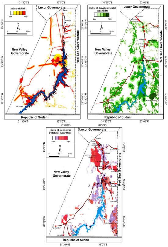 The study’s hypotheses were as follows: (1) The allocation of natural and economic resources in the northern and southern regions of the Aswan Governorate is fair and just. (2) The Aswan Governorate is ill-equipped to handle a substantial advancement in urban development across many areas. (3) The studied area is characterized by its high environmental sensitivity and vulnerability, necessitating the use of protective measures when engaging in dense urban growth. (4) The research area has a low density of urban development.