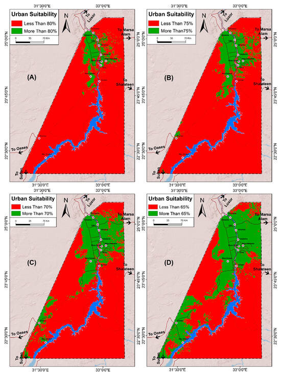 When considering the density of vegetation cover, urban areas are defined as regions that are far away from any vegetation. The most suitable categories are those with a distance from vegetation cover greater than 131.8 km. Naghibi et al. [59] describe groundwater as a crucial natural resource, found in the pores and fissures of rocks and sediments below the Earth’s surface. The tenth category, with poor aquifers and a concentration of about 70.5% on both sides of the Nile River, represents the least sensitive and most suitable category. The wells’ locations are a limiting factor that governs the progress of urban development. Urban areas are defined as locations located at a considerable distance from wells. The ninth and tenth categories, which are the least sensitive, are regarded as the ideals for urban areas. Distances from the wells exceeding 185.3 km represent these categories.