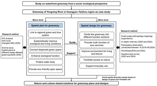 Mixed methods were applied to obtain an understanding of landscape planning for land transition and the greenway systems (district level), which are designed to improve local ecosystems, at the macro scale, and of everyday activities (e.g., recreation) at the micro scale. The overall aim was to pinpoint the interconnections between ecosystem restructuring at the macro scale and changes in the ways local people use the greenways in the course of their daily lives. The plan at the macro scale guided the use of land and the introduction of functions and services at the micro scale, while in return, people’s everyday use and their initiatives reshaped the designed greenways and further diversified the functions of the YRG. To this end, we employed GIS analysis, archive studies, and anthropological mapping and analysis (See Figure 1). The former two were applied to support our research at the macro scale. The interviews, questionnaire investigations, participatory observations, and workshops supported the anthropological mappings. Drawing on the empirical evidence, this research could help us reach our main goal of nature- and culture-based solutions for greenway plans and designs that avoid spatial diversity merely based on the design of space but instead are based on everyday use.