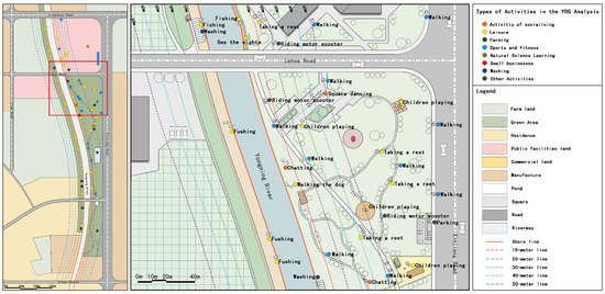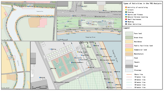 - Different patterns of activities could be identified. The spatial distribution of activities can be divided into three patterns: strip distribution, concentrated distribution, and scattered distribution. For instance, walking, fishing, and sightseeing are mainly distributed in strips along the river, while social activities such as dancing are concentrated in the main square. However, the distribution of parent–child interactions, picking herbs, etc. is scattered.