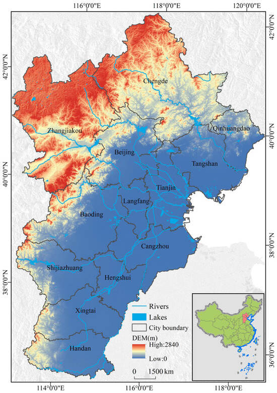 BTH includes the entire territory of Beijing, Tianjin, and Hebei Province (Figure 1). The land area covers 218,000 km2, accounting for about 2.3% of China’s total area. The region is hot and rainy in the summer, cold and dry in the winter, and has a typical temperate continental climate. The terrain slopes from northwest to southeast, with the northwestern part bordering Inner Mongolia and featuring extensive grasslands. The western region includes the Taihang Mountains and the northern region contains the Yan Mountains; both areas are rich in forest resources. The eastern region lies adjacent to the Bohai Sea, while the south is part of the North China Plain, characterized by its flat terrain.