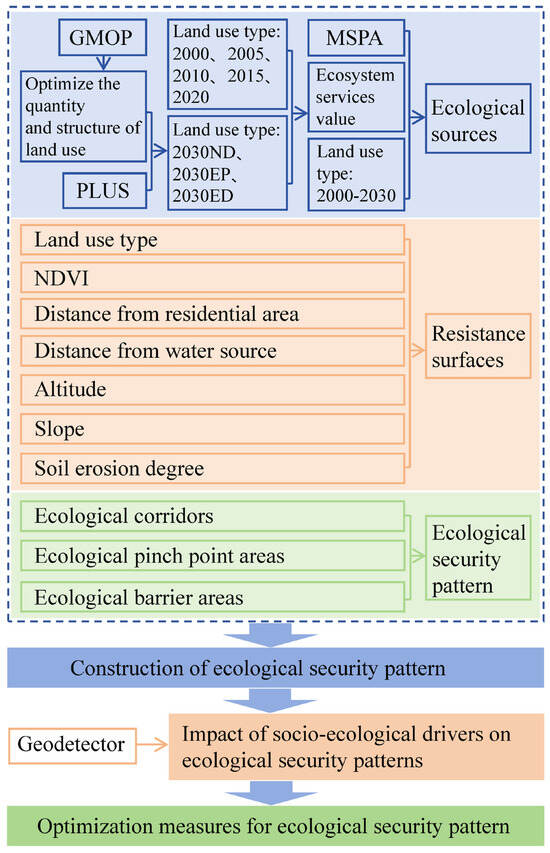 Ecological security represents a stable state where a healthy ecosystem provides a resource and environmental foundation for the long-term development of human society [9]. It is often linked to the goals of sustainable development [10]. The realization of ecological security relies on the planning of ecological security patterns (ESPs). Such planning can effectively connect fragmented habitat patches to form a complete ESP, thereby enhancing the quality of ecosystems [11,12]. Therefore, in the process of constructing regional ESPs, it is essential to consider fully the changes in ecosystem services and land use in the region. Besides advancing the construction of regional ESP, revealing how different socio-ecological driving factors affect these patterns is also crucial. This understanding is vital for identifying the ecological and environmental driving mechanisms in specific areas and designing effective protective measures to achieve sustainable development in the region [13].