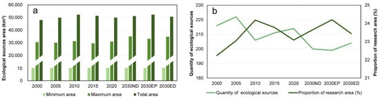 Statistics of ecological sources in BTH from 2000 to 2030. Note: (a) Ecological sources area in BTH from 2000 to 2030; (b) Quantity and proportion of ecological sources in BTH from 2000 to 2030.