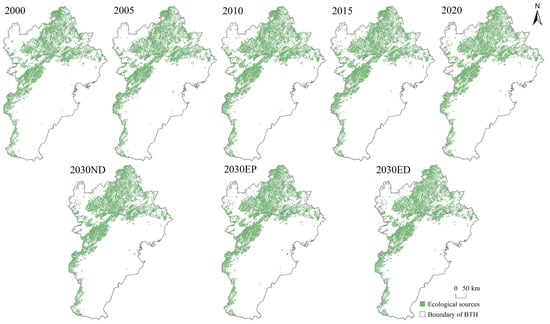 Spatial distribution of ecological sources in BTH from 2000 to 2030.