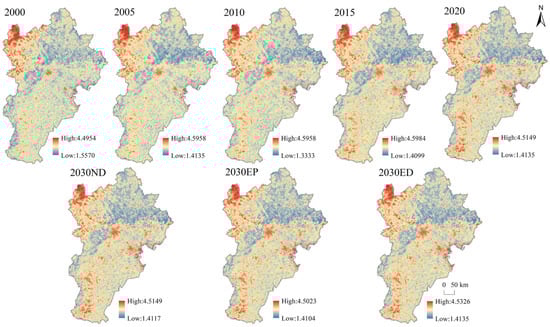 By 2030, projections under all scenarios suggest that the spatial pattern of ecological resistance—characterized by high values in urban and extensive farmlands in the south and southeast and lower values in less developed, mountainous regions—will largely remain stable compared with 2020 (Figure 5).