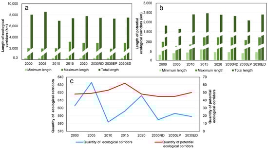 Statistics of ecological corridors in BTH from 2000 to 2030. Note: (a) Length of ecological corridors in BTH from 2000 to 2030; (b) Length of potential ecological corridors in BTH from 2000 to 2030; (c) Quantity of ecological corridors and potential ecological corridors in BTH from 2000 to 2030.