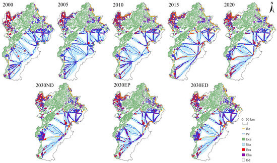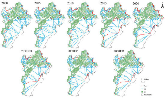 Spatial distribution of ecological corridors in BTH from 2000 to 2030. Note: Pec, potential ecological corridor; Ec, ecological corridor; Es, ecological source.