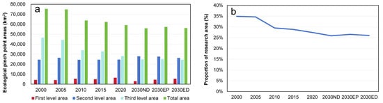 Statistics of ecological pinch point in BTH from 2000 to 2030. Note: (a) Ecological pinch point areas in BTH from 2000 to 2030; (b) Proportion of ecological pinch point areas in BTH from 2000 to 2030.
