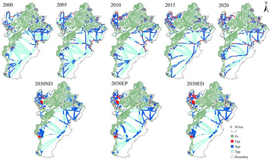 Spatial distribution of the ecological pinch point areas in BTH from 2000 to 2030. Note: Es, ecological source; Fpp, first-level pinch point area; Spp, second-level pinch point area; Tpp, third-level pinch point area.
