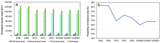 From 2000 to 2020, the overall trend for ecological barrier areas in the study region was a downward fluctuation, with an increase in the area of first- and second-level barriers and a decrease in third-level barriers. Although the overall resistance to the flow of matter and energy decreased, indicating some improvement in ecological quality, the degree of resistance to these flows actually increased. By 2030, under the EP scenario, the proportion of barrier areas (48.00%) was lower than in the ND (49.63%) and ED (49.40%) scenarios. The area of first- to third-level barrier areas under the EP scenario was lower than in 2020, as well as in the ND and ED scenarios, indicating a reduction in resistance to the flow of matter and energy and a gradual improvement in ecological environmental quality.