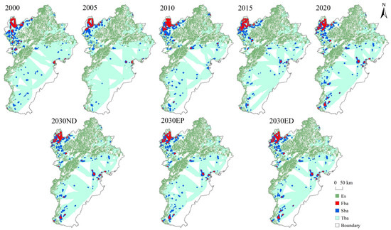 Spatial distribution of the ecological barrier areas in BTH from 2000 to 2030. Note: Es, ecological sources; Fba, first-level barrier area; Sba, second-level barrier area; Tba, third-level barrier area.