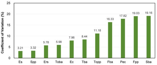 where σ is the standard deviation and μ is the average value. The CV values were divided into four categories as follows: lowest fluctuation (CV ≤ 10%); lower volatility (10% < CV ≤ 20%); medium fluctuation (20% < CV ≤ 30%); high volatility (CV > 30%) [70].