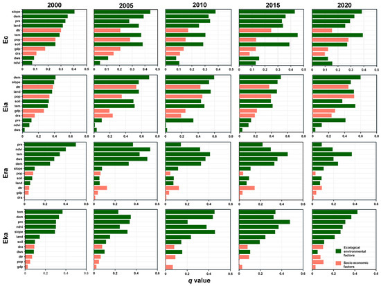 Ecological factors such as topography, geomorphology, and climate, as well as socio-economic factors like economic development, influence the spatial distribution of an ESP. We listed the independent variable factors, as shown in Table 4, and executed the Geodetector analysis in RStudio using the “GD” package [73,74] (https://www.r-project.org (accessed on 2 September 2023)).
