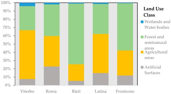 Land cover stacked bar chart of the Lazio provinces (Corine Land Cover 1° Level/Province area ratio) divided into four land use macroclasses. Artificial surfaces are classified in grey, agricultural areas are in orange, forest and seminatural areas are in green, and wetlands and water bodies are in blue.