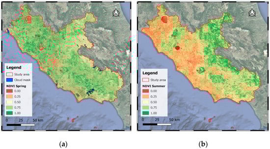 NDVI from Sentinel-2 images for the study area and for two seasons. (a) Spring NDVI, (b) Summer NDVI.