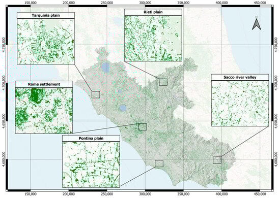 The study area was Lazio, a region in central Italy, located between 11°26′ and 14°01′ E and 40°47′ and 42°50′ N. It covers an area of 17,242 km2 and is divided into five provinces: Viterbo, Rieti, Rome, Frosinone, and Latina. The region is characterized by a Mediterranean climate in the coastal and hilly areas with mild temperatures (9 °C in winter and 24 °C in summer) and low precipitation (700 mm/year), while in the Apennine areas, a continental climate is found, with winter temperatures below 0 °C and abundant precipitation (1200 mm/year) [60,61]. Elevations range from 0 m above sea level in coastal plain areas to areas of the Apennine Mountain range with altitudes exceeding 2000 m above sea level.