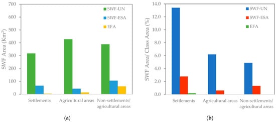 The “Settlements” and “Non-settlements/Agricultural areas” classes had a comparable SWF surface area for the SWF-UN data. However, the extent of “Non-settlements/Agricultural areas” was higher than that of “Settlements” (7972 km2 vs. 2369 km2), resulting in a SWF-UN percentage of 4.9% compared to 1.3% for the SWF-ESA data, while the EFA data identified a significantly lower surface area, less than 1%.