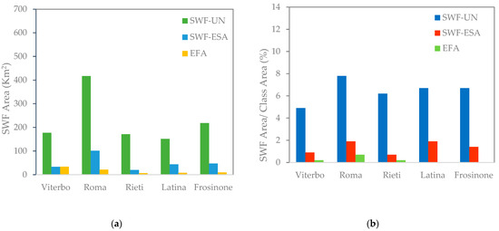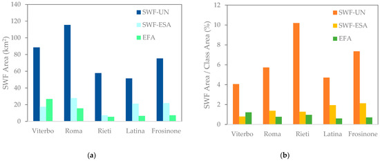 In bar plot (a), the SWF surfaces in the provinces of the Lazio region for the evaluated SWFs maps (SWF-UN, SWF-ESA, and EFA). (b) Percentage ratio between the SWF area and the area of the provinces.