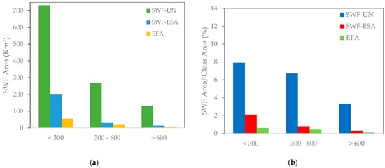 From the evaluation of SWFs in the altitude bands (Figure 6), the highest presence of SWFs was identified in the plain class (<300 m), accounting for 7.9% of the plain area (9250 km2). The SWF-ESA and EFA data also confirmed this. Conversely, the area with the lowest level of mapped SWFs was the mountainous region (>600 m above sea level), with respective percentages of 3.3% for the SWF-UN data, 0.3% for the SWF-ESA data, and 0.1% for the EFA data.