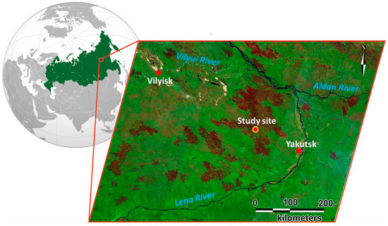 The study area is located in the central part of the Lena-Vilyui interfluve, 200 km west of Yakutsk city, on the Central Yakutian Plain and has an altitude of 300–400 m a.s.l. (Figure 1). The formation of relief is greatly influenced by the presence of continuous permafrost, where the depth of permafrost reaches 400–700 m [35]. The relief is rolling plain with shallow valley landscapes and alas depressions (thermokarst). The inter-alas areas are uneven and composed of depressions and elevations, where light-coniferous taiga with Larix cajanderi and Pinus sylvestris predominates.