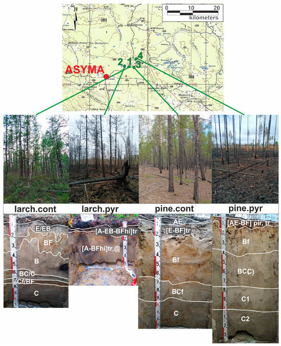 To study the impact of 2021 catastrophic fires on the soils, the control plots with two sites were established in the summer of 2022 within a 10 × 10 km square near the Asyma village, on the areas of pine and larch forests most affected by fire (Figure 2). At each forest, the monitoring sites were located on similar landscapes according to the following scheme: 1. larch.cont—in a larch forest untouched by fire, 2. larch.pyr—burnt area affected by a ground fire in the larch taiga, 3. pine.cont—unburnt control site in a pine forest with signs of old weak ground fire and 4. pine.pyr—pine forest burned out after a strong ground fire.