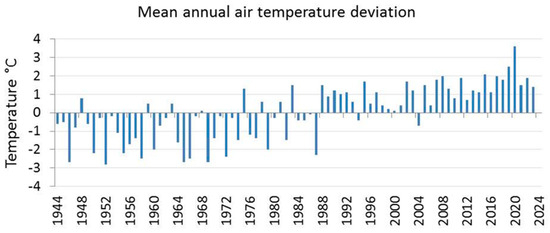 Figure 3. Deviation of the MAAT from the long-term average for the measurement period (1944–2023), Berdigestyakh weather station.