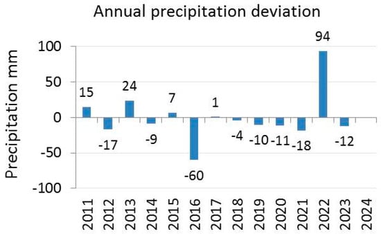 Figure 4. Difference in annual precipitation from the long-term average for the measurement period (2011–2023), Berdigestyakh weather station.
