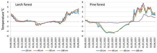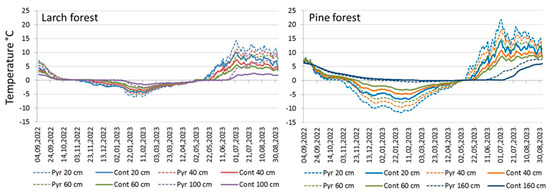 In the pine.cont and pine.pyr the temperature amplitude is higher than in larch sites (Figure 5). At a depth of 20, 40, and 60 cm, the soil temperature in the pine.pyr reached its minimum almost on the same day (January 31–February 1): −11.51 °C, −9.54 °C, and −7.93 °C, respectively. At 160 cm, the lowest temperatures were recorded on February 21–24 and were equal to only −0.54 °C. In the pine.cont, the minimum temperatures at a depth of 20 and 40 cm, as in the burnt forest, were recorded on January 31 (−6.72 °C) and February 1 (−4.96 °C). Deeper, at 60 cm, the minimum temperature of −3.45 °C was reached much later (February 13). At a depth of 160 cm, the minimum was on March 28. The difference between the minimum temperatures in the burnt and control pine forest was 4.79, 4.58, 4.48, and 0.44 °C for 20, 40, 60, and 160 cm, respectively (Figure 6).