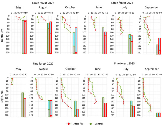 Figure 7. Soil moisture (in %) after the fire in larch and pine forests in 2022–2023. The columns show the depth of soil thawing and the groundwater level: gray column—permafrost, blue column—groundwater. The colors of the columns’ perimeters indicate control (green) and burnt (red) sites.
