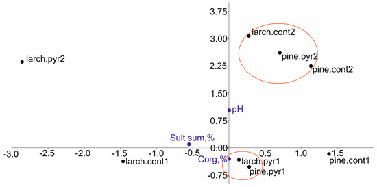 Figure 8. Scatter plot of correspondence analysis of soil properties. Indicators: pH—acidity; Salt sum—sum of salts, %; Corg—organic carbon, %. Sample groups: larch.cont—soil under an untouched larch forest; larch.pyr—soil under burnt larch forest; pine.cont—soil under untouched pine forest; pine.pyr—soil under pine burnt forest. The numbers next to the sample groups indicate the location of the sample in the profile: 1—organic horizon, 2—upper part of the mineral layer.
