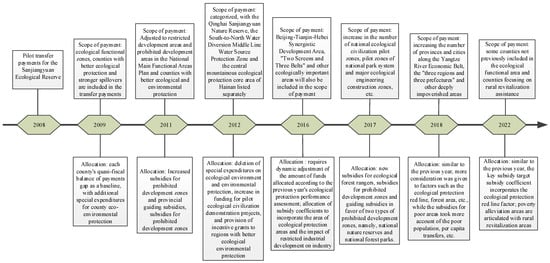 Eco-transfers in China are expressed in the form of transfers to key ecological function areas, which is a financial mechanism with the nature of eco-protection; the objectives are to enhance the ability of the government of the ecological function areas to provide basic public services and incentivize them to maintain the regional ecological environment security and stability [,]. The system, which has been implemented for nearly 15 years since 2008, is the only ecological transfer in China’s current ecological transfer practice with institutional safeguards from the central government and provincial governments as well as a stable allocation of financial funds; it also involves the widest range of payments and the largest transfer and has become the largest governmental ecological protection compensation program in China and even in the world [,]. Based on the administrative level, the ecological transfer system can be categorized into two types: central-to-provincial and provincial-to-county. Given that this study takes the counties in Hubei Province as the research unit, the evolution of the ecological transfer system from the province to the counties is only sorted out for the ecological transfer system from Hubei Province to the counties.