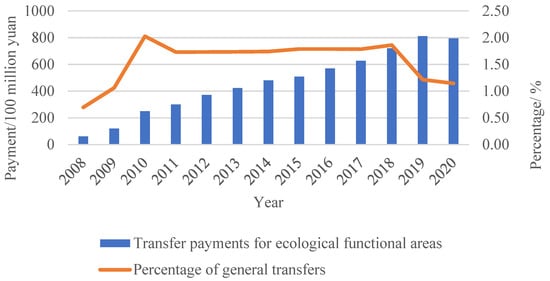 Since the establishment of the national key ecological function zone transfer payment system in 2008, the covered counties have increased year by year, from 221 in 2008 to 818 in 2020, an increase of roughly four times the initial rate. In addition, the coverage of provinces has also expanded from the previous 17 provinces to 31 provinces (municipalities and autonomous regions). The distribution area is primarily concentrated in the relatively backward central and western regions of China, and the number of transfer payments accounts for roughly two-thirds of the total counties. In terms of the amount of transfer payments, the period from 2008 to 2020 has also shown a roughly year-on-year increase, from 6.58 billion yuan in 2008 to 79.45 billion yuan in 2020 with a cumulative total of 603.622 billion yuan having been invested, representing an average annual increase of 30.27 per cent. The year with the fastest growth was 2010, 2.08 times that of 2009, mainly due to the implementation of the National Main Functional Areas Plan, which expanded the number of counties in which the central government implemented ecological transfers and the amount of payments. From the standpoint of the proportion of transfer payments, the amount of financial transfers to ecological functional zones as a proportion of general transfer payments has also grown from 0.70% in 2008 to 1.14% in 2020, with the largest proportion in 2010 at 2.03%; it basically stabilized at roughly 1.80% in 2011−2018 and then declined in 2019−2020. Although the amount of this ecological transfer and its share of general transfers has been gradually increasing overall, the overall size of the funds transferred is small, which is less than two percent of general transfers as shown in Figure 2.