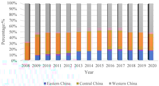 In terms of regional distribution, since the start of the pilot program in 2008, the number of provinces in which the central government has made ecological transfer payments to localities has increased from 17 provinces (municipalities and autonomous regions) in 2008 to 31 in 2012 with the focus of the funds being shifted from naturally ecologically rich areas in the central and western regions to ecologically rich areas in all provinces and territories of the country. From 2008 to 2020, the three provinces with the highest cumulative ecological transfer payments from the central government to local governments are Gansu, Guizhou, and Xinjiang, with cumulative payments of 48.712 billion yuan, 44.75 billion yuan, and 36.573 billion yuan, respectively. Whereas the three provinces (municipalities) with the lowest cumulative payments are Shanghai Municipality, Tianjin Municipality, and Jiangsu Province with cumulative payments of 321 million yuan, 472 million yuan, and 982 million yuan, respectively, with the former being the largest multiple of the latter by roughly 152 times. From the distribution structure of each region (see Figure 3), the western region receives the most ecological transfer funds, growing from 4.19 billion yuan in 2008 to 42.461 billion yuan in 2020, accounting for up to 69.23% of the national ecological transfer funds. Then, with the expansion of the scope of transfer of the ecological functional areas in 2012, the proportion it accounts for has declined, but the proportion still reaches 53.44%. The eastern region receives the least amount of ecological transfer funds with only Hainan Province being included in the scope of the transfer during the pilot period in 2008 with a transfer amount of only 27 million yuan. Then, with Shanghai, Jiangsu, Zhejiang, and other provinces being included in the scope of the transfer, the amount of transfer has increased. By 2020, the ecological transfer funds it receives as a proportion of the national ecological transfer funds has risen to 17.45%. The ecological transfer funds received by the central region have grown from 1.834 billion yuan in 2008 to 23.128 billion yuan in 2020 with the proportion of the national ecological transfer funds generally stabilizing at roughly 30 per cent. As a region rich in ecological resources and relatively backward in economic development, the central and western regions of China have taken on too much responsibility for ecological protection, resulting in limited economic development. In addition, the central government’s ecological transfers to the provinces are biased toward the central and western regions, reflecting the purpose of incentivizing local governments to maintain regional ecological environments and balancing local financial resources to narrow the gap. However, in recent years, as some provinces in the eastern region have been included in the scope of ecological transfers, the proportion of general ecological transfers received by the eastern region has gradually increased. By contrast, the proportion of financial transfers received by the central and western regions has declined. Moreover, the dilemma of insufficient financial resources of the central government and insufficient centralized transfers in the central and western regions may reduce the incentive of the central and western regions to protect the ecological environment to a certain degree.