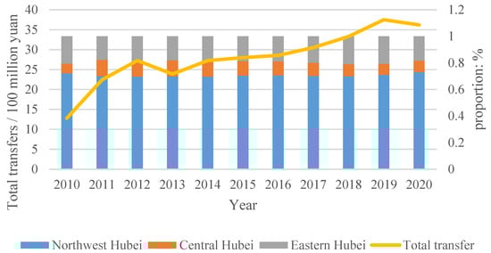 The provincial-to-county ecological transfer payment system is based on the central-to-provincial ecological transfer payment system, combined with the ecological resources of the provinces (municipalities), to establish the scope of the general ecological transfer payment in the province and according to the “National Key ecological function zone transfer payment measures” to formulate the provincial ecological transfer payment measures for the county ecological function zone. For the first time, 28 counties (cities and districts) in Hubei Province were included in the national key ecological function zones. In 2017, according to the adjustment of the transfer payment scope of the national key ecological function zones, Tongshan County and Tongcheng County in Hubei Province were included in the national key ecological function zones, and a total of 30 counties (cities and districts) were included in the national key ecological function zones. In addition, in Hubei Province, based on the province’s ecological resources profile and the province’s implementation of major ecological projects’ construction areas and on the basis of the key ecological functional areas designated by the state, 18 counties (cities and districts) adjacent to the key ecological functional areas, such as Enshi City, Yangxin County, and Jingshan County, have been included in the scope of provincial-to-county general ecological transfer payments. In terms of fund allocation, the factor method is used for calculation and allocation; that is, the total number of ecological transfer payment subsidies in a county is the sum of the numbers of key subsidies, prohibited development zone subsidies, and incentives and punishments. The number of key subsidies is the sum of the previous year’s base, the current year’s allocation increment, and the phased bottom-up subsidy. The incremental allocation for the current year is obtained by multiplying the degree of financial difficulties of the county with the transfer subsidy coefficient. The phased bottom-up subsidy is mainly based on the newly incorporated ecological functional zones with no subsidy base, and the subsidy sub-item is set up to equalize the level of subsidies for the various counties. The subsidy for prohibited development zones is based on the area of national prohibited development zones in each region and is tilted in favor of two types of prohibited development zones, namely national nature reserves and national forest parks. The number of rewards and penalties and incentive grants is based on the results of the provincial ecological and environmental assessment of the counties. Those with a comprehensive assessment score lower than −1 and −0.5, respectively, shall not participate in the year’s incremental allocation of subsidies and according to the value of the proportional deduction of the subsidy base shall be liable to the implementation of penalties. The comprehensive assessment is performed with choices ranging from “generally better” to “significantly better,” to take a proportionate share of the central and provincial incentives for the implementation of incentives.