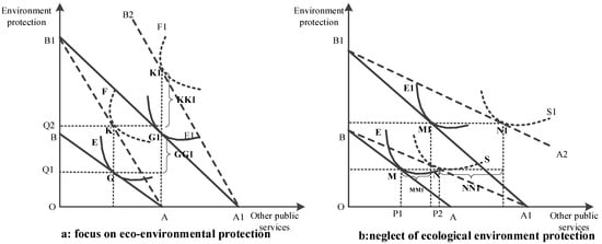 As shown in Figure 5a, for the convenience of analysis, the fiscal budget of local governments between the dual objectives is regarded as the behavioral process of rational economic man who chooses consumption between consumer goods; the horizontal axis indicates that the local government spends the financial funds on other public service supply to develop the economy, and the vertical axis indicates that the local government spends the financial funds on ecological environmental protection. We assume that before obtaining ecological fiscal transfers, the local government’s fiscal budget constraint line is AB, and the corresponding utility function curve is E. After obtaining ecological fiscal transfers, if the local government’s choice preferences have not changed, its budget constraint curve is flattened from AB to A1B1, and the corresponding utility function curve is E1. If the local government emphasizes ecological environment protection, its budget constraint curves are AB1 and A1B2, and the corresponding utility function curves are F and F1. Based on points G and K, under the condition that the budgetary input of local governments for other public service provision remains unchanged, local governments that emphasize ecological environmental protection will increase the ecological environmental protection input from OQ1 to OQ2. From the comparison of GG1 and KK1, the ecological fiscal transfer funds will substantially enhance the ecological environmental protection inputs of the local governments. Similarly, as shown in Figure 5b, if the local government emphasizes improving the supply of other public services but neglects the ecological environment protection, its budget constraint curves are A1B and A2B1, and the corresponding utility function curves are S and S1. Based on points M and N, under the condition that the local government’s budgetary input for ecological environmental protection remains unchanged, the local government that emphasizes economic development will increase the ability to provide other public services from OP1 to OP2. From the comparison of MM1 and NN1, the ecological fiscal transfers will substantially increase the local government’s use of the funds for the provision of other public services while ignoring ecological environmental protection.
