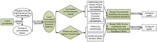 The ecological financial transfer payment system implemented in China has typical Chinese characteristics. It is an institutional arrangement that tilts the transfer system to ecological functional areas by increasing the weight of ecological environment in the design of balanced transfer payment and allocates funds based on the “standard financial gap”, supplemented by comprehensive financial security coefficients such as ecological protection areas, industrial development constraints, and population size with subsidies on the basis of the standard financial gap accounting for 75 per cent of all transfer funds. Does the eco-transfer system carried out on the basis of such design concepts and fund allocation methods have the same eco-environmental effects? Some scholars have explored this issue but produced inconsistent conclusions. Some scholars have argued that China’s ecological financial transfers have helped improve regional ecological quality. To illustrate, Zhang and Chen, based on the empirical analysis of panel data from 2008–2018 in 31 provinces (cities) across China, found that the eco-transfer system significantly enhances the local government’s investment in pollution control, suppresses the local government’s pollutant emissions, and improves the regional ecological environment quality []. Gong et al. explored the national key ecological functional zones as an empirical sample and similarly found that the implementation of the ecological fiscal transfer system can effectively incentivize local governments to strengthen the environmental regulation of industrial pollution, effectively reduce the local government’s industrial pollution emissions, and improve the ecological environment quality []. Li and Xue conducted a study using the county scale as the evaluation unit and similarly found that eco-transfers promoted the effectiveness of local governments’ environmental governance behaviors and played an incentive effect on county environmental protection []. However, some scholars argued that China’s eco-fiscal transfers have not significantly improved the ecological quality of the environment. For instance, Miu and Zhao, based on China’s provincial panel data, found that the financial transfer system of ecological functional areas only played the compensation effect of funds in the process of improving the ecological environment effect and did not effectively incentivize local governments for eco-friendly governance; this phenomenon led to a decrease in the significant effect of the system in improving the ecological environment []. Cao et al. similarly found that the system implemented in China incentivized local governments and somewhat improved environmental quality but did not contribute to the improvement of ecological quality and even failed to leverage the funds []. Li et al. analyzed the longitudinal and horizontal comparison of the ecosystem pattern before and after the ecological transfer payment; they subsequently concluded that the ecological transfer payment system can somewhat improve the ecosystem environmental quality, but the improvement effect is insufficient []. On the one hand, the divergence in research views may primarily be due to the differences in research regions and research scales, which have different geographic characteristics and may reveal different phenomena and laws []. In comparison, additional micro-scale research is closer to the essence of the phenomenon. On the other hand, it may be due to the difference in theoretical modeling, which is often based on different theoretical logic and research perspectives, thus leading to different research views. Therefore, an urgent need arises to clarify the theoretical logic and key variables between eco-transfers and ecological environment improvement to clarify the mechanism between the two and to clarify the actual impact of eco-financial transfers on ecological environment improvement.