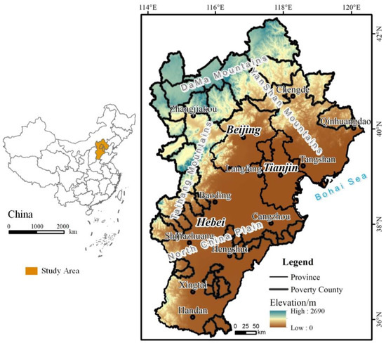 As regions with relatively lagging socio-economic development, the CCD, among multiple factors such as the economy, environment, and society within the PSCs, is crucial for achieving sustainable development. The PSCs often face challenges such as resource scarcity and increased environmental pressure, which necessitate the formation of efficient coordination among various factors within the region to break through development bottlenecks [35]. As an essential part of China’s economic and social development, PSCs face numerous challenges. Promoting development, narrowing the urban–rural gap, eradicating poverty, and achieving common prosperity are ideals that humanity continually pursues. Inadequate natural conditions, poor geographical conditions, and fragile ecological environments are the primary driving factors of persistent poverty [36]. In recent years, with the deepening of poverty governance, an increasing number of studies have begun to focus on the development issues of PSCs. For instance, the contiguous poverty-stricken areas in the Qinba Mountains suffer from poor infrastructure, weak resource and environmental carrying capacity, the inability to sustain more prosperous socio-economic activities, lagging economic development, a single industrial structure, and a lack of large-scale industries [37]. Wu et al. [38] have found that the government’s environment-friendly policies and mechanisms can achieve the dual goals of poverty alleviation and environmental pollution reduction. Duan et al. [39] have investigated the impact of China’s agricultural certification policies on economic growth in PSCs. The CCD, as an important indicator to measure the interaction and coordinated development level between systems, is significant for understanding the poverty dynamics of PSCs and formulating effective poverty alleviation policies. Deeply exploring the relationship between PSCs and the CCD can provide new perspectives and ideas for poverty governance and regional development. In recent years, some studies have focused on the economic and ecological coupling coordination relationship in PSCs. For example, Ge et al. [40] established an indicator system for socio-economic and environmental sectors in poverty-stricken areas of China and calculated the level of the CCD to assess the coordination relationship between them. Based on the CCD model, Meng et al. [41] analysed the economic and ecological coupling coordination status of poverty-stricken areas in Guizhou Province. Chen et al. [42] constructed a coupling indicator system for poverty and ecological vulnerability, and analysed the coupling relationship between the ecological environment and poverty from a village-level perspective. The PSCs are an important part of the Beijing–Tianjin–Hebei urban agglomeration. Deeply studying the coupled development of the economy and ecology in this region is conducive to narrowing the urban–rural gap within the region and promoting coordinated regional development. Conducting research on the economic and ecological coupling coordination of the PSCs not only aligns with China’s practical needs to vigorously promote poverty reduction and urbanization development, but also provides reference cases for other poverty-stricken areas, helps enrich regional development theories, and offers insights for the formulation and implementation of relevant policies. Therefore, this study focuses on the PSCs, aiming to deeply explore the development mechanisms and changing characteristics of their CCD, and to provide a scientific basis for formulating effective poverty alleviation and sustainable development policies. The selection of the PSCs as the primary region for this study is primarily based on the following considerations: Firstly, the PSCs serve as the frontline in China’s battle against poverty, and their development status is directly linked to the achievement of national poverty alleviation goals. Secondly, these counties confront numerous challenges in economic development, environmental protection, and social progress, making the study of their CCD crucial for understanding regional development mechanisms. Lastly, by conducting a thorough analysis of the CCD in poverty-stricken counties, we can provide valuable insights and lessons that can be applied to other similar regions. This study is based on the land use/cover change (LUCC) remote sensing monitoring data, economic statistics, Net Primary Productivity (NPP) data, annual precipitation, and soil data from 2000 to 2020 and adopts statistical analysis and spatial analysis. The main objectives include analysing the status of the RE and major EQ in the BTH region, describing the trends of the RE and EQ in the BTH region from 2000 to 2020, and exploring the CCD between the RE and major EQ, which will in turn reveal the relationship between the RE and EQ. This study is expected to provide a scientific basis for the coordinated development of the BTH region.