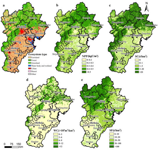 Figure 2. Spatial distribution of ecosystem structure and ecosystem services in the BTH region in 2020: (a) ecosystem structure; (b) NPP; (c) soil conservation; (d) water conservation; and (e) sand fixation.