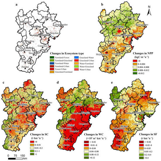 In terms of spatial distribution, the increase in urban ecosystems was mainly distributed around the municipal districts. Urban land occupying wetlands were mainly distributed in the coastal areas of Tianjin, Tangshan, and Cangzhou; those occupying grasslands were mostly located in Zhangjiakou and areas along the Taihang Mountains in the west; and those occupying forests were mainly located in the northern areas of Chengde and Tangshan. The growth in wetlands was mainly located in the southern region of Tangshan. The growth of farmland, grassland, and forest ecosystems was sporadically distributed around the Beijing–Tianjin municipal area (Figure 3a). NPP showed a significant upward trend (p < 0.05), and the relative increase was highest in the Yanshan Mountains region and the mountainous areas north of Beijing, with decreasing trends of varying degrees in the municipal districts and the eastern coastal belt area (Figure 3b). Soil conservation, water conservation, and sand fixation services all showed an increasing trend, but not significant (p > 0.05). The relative increase in soil conservation was highest in the Yanshan Mountains region and along the Taihang Mountains in the west (Figure 3c), with a decreasing trend in the Beijing–Tianjin–Tangshan and central Hebei Plain regions. The increase in the water conservation capacity was relatively high in the same Yanshan Mountains region and along the Taihang Mountains in the west, while the majority of the eastern and southern regions and the dam areas had a decreasing trend (Figure 3d). The amount of sand fixation increased more in the Zhangjiakou and Bohai Rim coastal areas but decreased in parts of the northeast and southwest regions (Figure 3e).