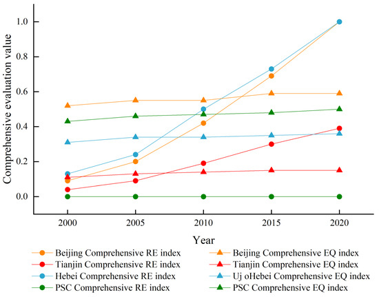 The comprehensive RE and EQ index in the BTH region from 2000 to 2020 showed an upward trend (Figure 4), in which the comprehensive RE index grew significantly faster than the EQ and the comprehensive RE index of Tianjin and Hebei exceeded the composite EQ index from 2005–2010, and Beijing’s transition occurred between 2010 and 2015, while the two types of composite indices of the PSCs were always in a parallel state with weak changes. The comprehensive RE index was low in 2000, separate from the changes in the two comprehensive indices. Beijing, Tianjin, and Hebei grew faster between 2000 and 2010. The growth rate slowed after 2010, while the PSC index continued to show weak changes between 2000 and 2020, which indicates that there were large differences in economic development within Hebei Province and that the rapid development of the neighbouring areas did not occur in the PSCs. The comprehensive index of the EQ in each region varied considerably in 2000 and grew slowly, and the change in the comprehensive index of each region from 2000 to 2020 was less than 0.1, and the scope of change was Beijing, PSCs, Hebei, and Tianjin in descending order, which indicates that the EQ of the BTH region had not significantly improved.