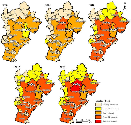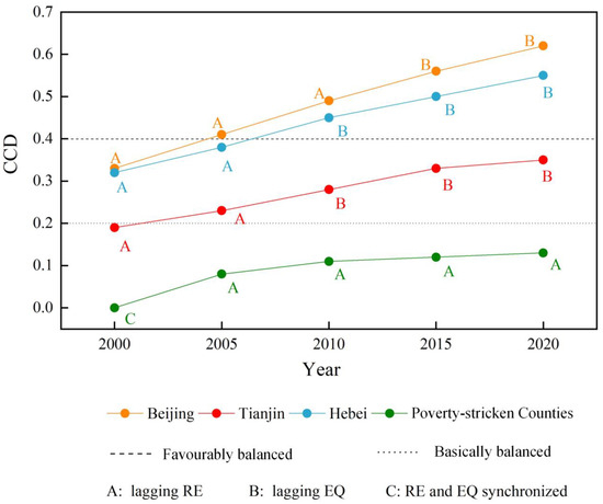 Figure 5. CCD for various regions of the BTH region from 2000–2020. (A: RE lagging type; B: EQ lagging type; and C: RE and EQ synchronization type).