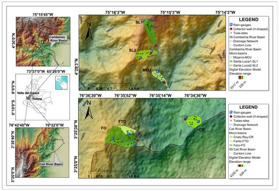 The location of the experimental micro-watersheds Santa Lucía 1 natural forest (SL1), Santa Lucía 2 Pastures (SL2), and Mojarra/coffee agroforestry system (MOJ) in the Combeima River basin in Tolima (above); micro-watersheds Faro natural forest (FO), Farito coffee agroforestry system (FTO), and Cristo Rey Pastures (CR) Cali River basin (below) in Valle del Cauca. The distribution of the instrumentation is shown.