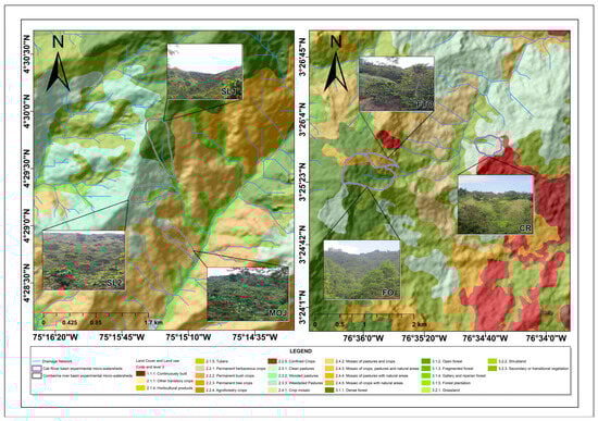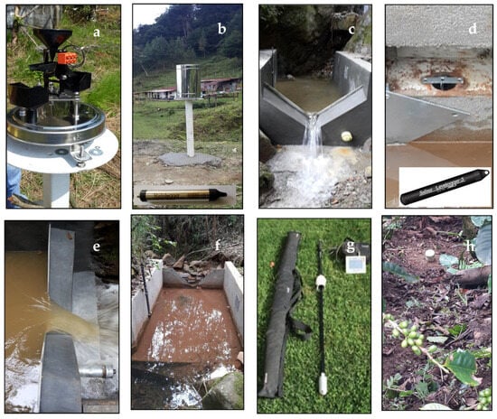 This research was conducted in six experimental micro-watersheds (EMs) within the Combeima and Cali River basins, located in the Tolima and Valle del Cauca departments of the central Andean region of Colombia. The EMs, situated between 1250 m and 2350 m elevations, were categorized into three LULC classes: natural forest (NF), pasture (P), and coffee agroforestry system (AS-c). Figure 1 shows the distribution of the EMs (Santa Lucía 1 (SL1), Santa Lucía 2 (SL2), Mojarra (MOJ), Faro (FO), Farito (FTO), and Cristo Rey (CR)), their respective LULC. Figure 2 shows the LULC map for the study area and its surroundings, which is consulted on the official platform of the Institute of Hydrology, Meteorology and Environmental Studies (IDEAM) for the most recent year available in the open database (https://qrcd.org/63VD (accessed on 21 June 2024)). Similarly, for each MS, the images taken by the author for the comparison and verification of the state of LULC in the basins under study are shown. The instrumentation setup is shows in the Figure 3a–h.
