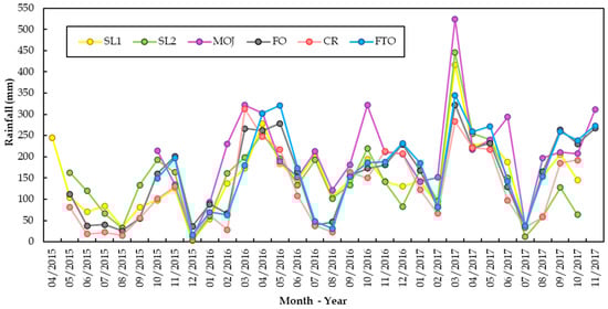 As for CR, in June, July, August, and December 2015, as well as in July and August 2016, PPT showed the lowest values during the observation period. December 2015 was the driest month, while March 2016 and March 2017 were the wettest. The year 2015 was significantly drier than 2016, and March to May 2016 and 2017 were the wettest months.